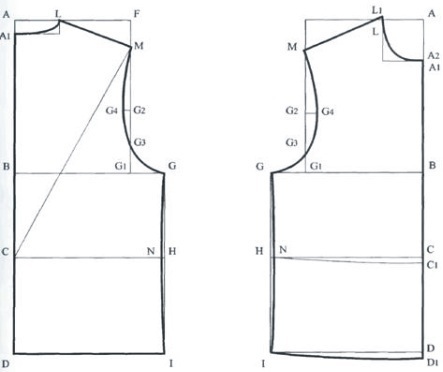 Построение спинки Строим прямой угол из точки А. АВ = высота проймы сзади (Впрз ) + прибавка. (Пример: 23 см + 2 см = 25 см.) АС = длина спины до талии (Дет) + прибавка. (Пример: 42 + 1 см = 43 см.) CD = высота линии бедер (Вб). (Пример: 18 см. Подробнее...